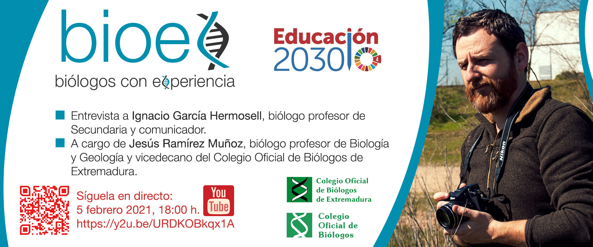 Es vista de ello, el viernes 5 de febrero de 2021 a las 18:00 horas (19:00 CEST) tienes una cita con “Entrevistas a Biólogos con Experiencia”, en la que el invitado será Ignacio García Hermosell, biólogo profesor de secundaria y comunicador, que será entrevistado por Jesús Ramírez Muñoz, biólogo profesor de Biología y Geología y vicedecano del Colegio Oficial de Biólogos de Extremadura.